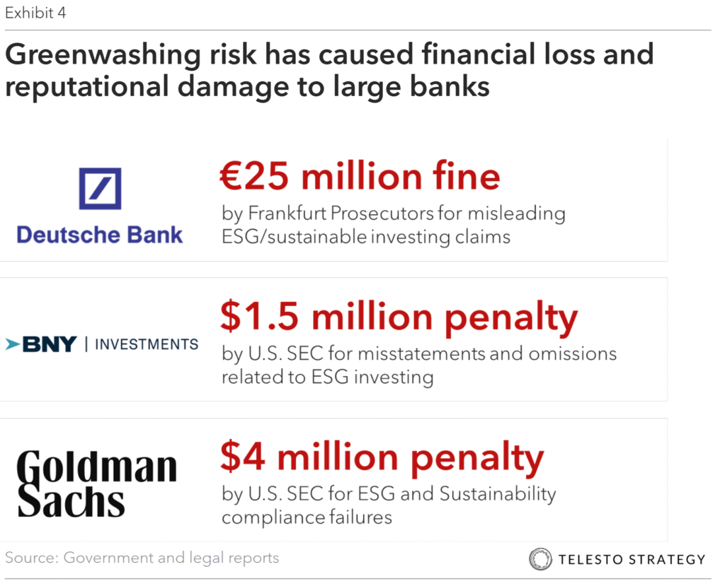 Beyond emissions, banks face growing scrutiny over social and environmental impact claims. High-profile enforcement actions — ranging from €25 million fines in Europe to multi-million-dollar SEC penalties in the U.S. — underscore the financial consequences of weak or misleading ESG disclosures.