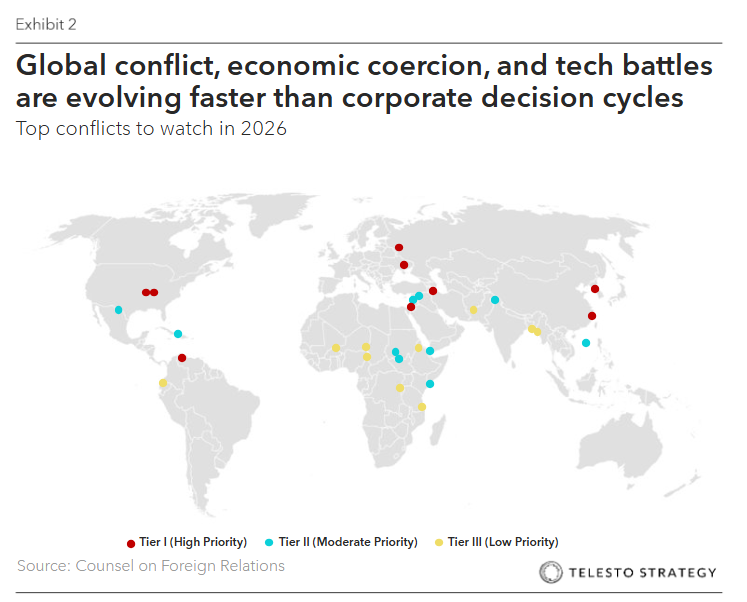 Telesto Strategy is closely monitoring the changing geopolitical environment; we see the following as the flashpoints to watch as we start 2026: