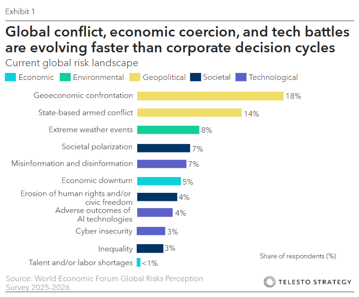 In 2026, geopolitics no longer simmers in the backdrop; instead, it should be considered a design constraint for growth, capital allocation, and operational continuity. As opposed to thinking about which conflict is most likely to erupt, leaders will have to understand which stack of pressures will compound fast enough to break our assumptions. The World Economic Forum’s 2026 Global Risks Perceptions Survey puts geoeconomic confrontation (e.g., tariffs, investment restrictions, resource leverage) as the top short-term risk, now overtaking armed conflict. The central question worth exploring – can your firm absorb shocks without halting growth?
