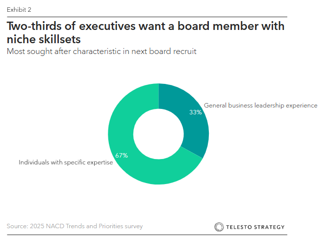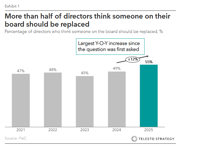 Yet, at the same time, in 2025 PwC reports that directors still over-index on traditional expertise and director pipelines remain dominated by former CEOs, CFOs, and industry specialists. However, this hasn’t necessarily fostered confidence across board cohorts; more than half of corporate directors think at least one director should be replaced and that assessment processes often fail to surface skills gap.