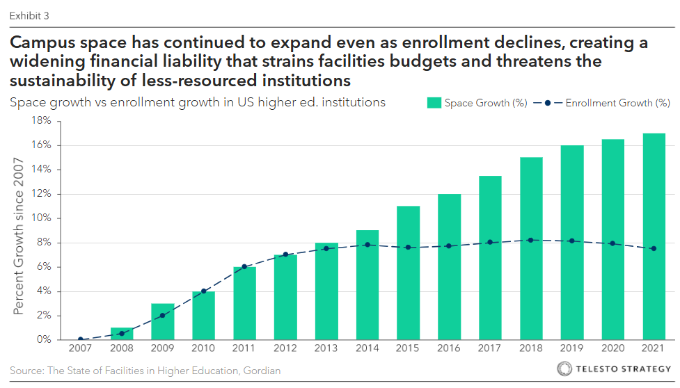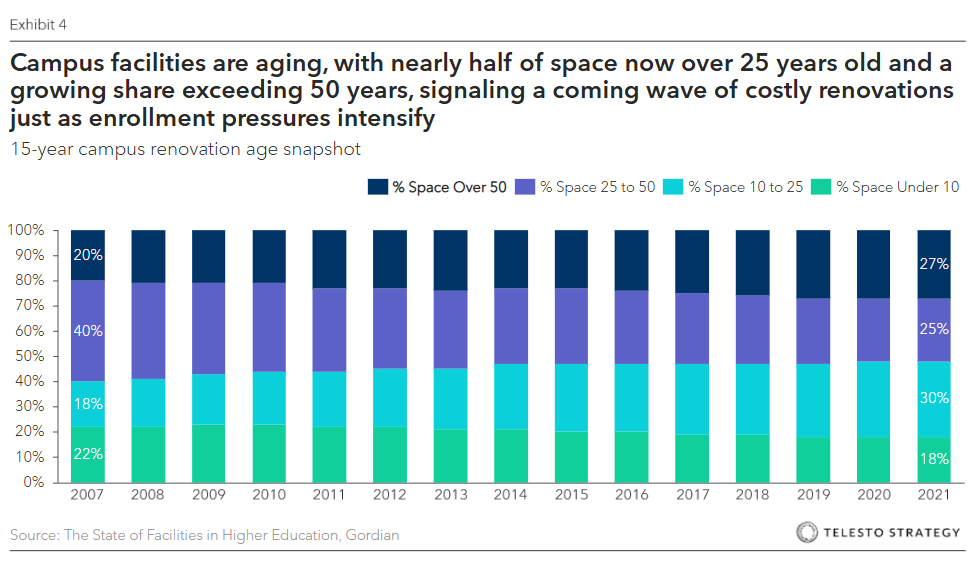 - Space growth outpacing resources. Campus footprints more than doubled since 1970 (+113%), while the college-age population grew just ~17%. More space plus older space—without matching O&M budgets—equals ballooning liabilities
