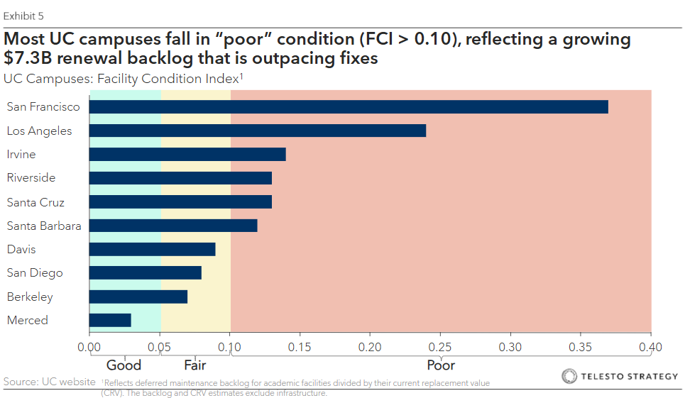 - California Public Universities. Chronic underinvestment as left UC and CSU with $17.4B in deferred maintenance. Many campuses exceed FCI > 0.10, with aging systems and sprawling footprints. Without a long-term funding plan, the Legislative Analyst’s Office warns costs will balloon and disruptions will worsen.