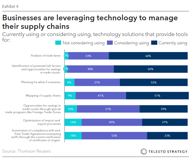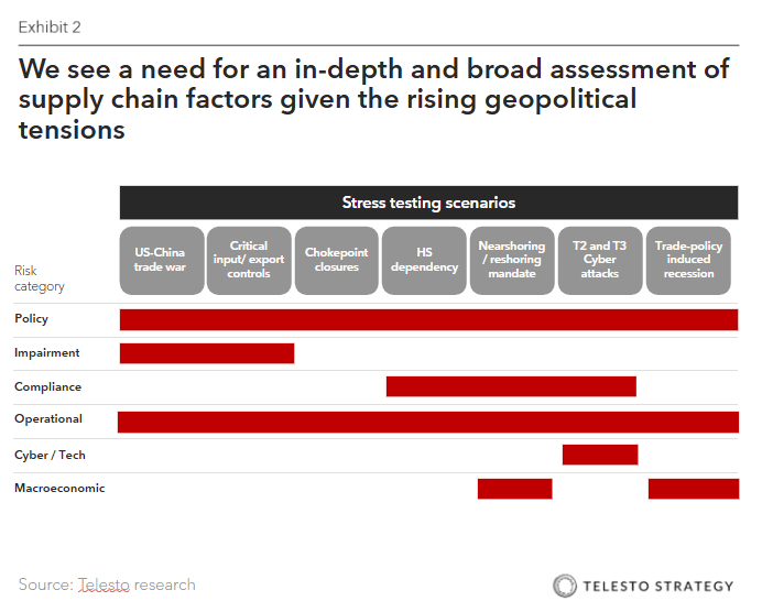 • Escalating U.S.-China trade war. Stimulate scenarios where tariffs on a specific country or region, such as China, escalate by 10-25% on a particular category of goods, forcing companies to find new sourcing options in an accelerated time frame.