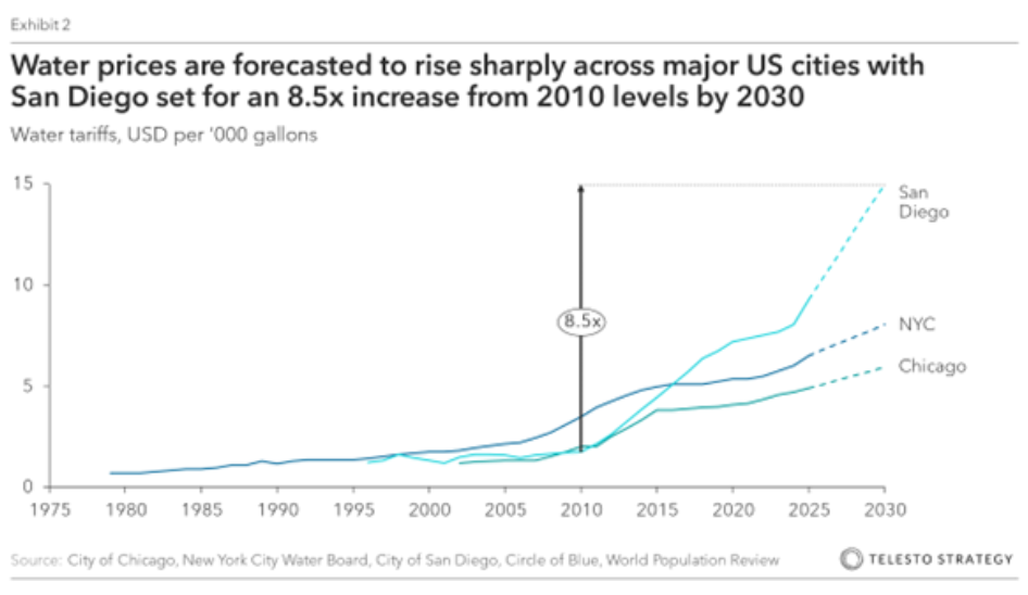 - Rising water costs and pricing volatility: Water is becoming an increasingly large and volatile operating expense for real estate assets. Between 2010 and 2017, water tariffs surged by an average of 54% across major U.S. cities, and residential bills climbed ~64% nationally during 2012-23. These hikes are squeezing NOI, particularly for water-intensive properties like resorts, multifamily complexes, and data centers. Unlike energy, water cost increases are less easily mitigated through efficiency or alternative sourcing, leaving owners exposed to unpredictable surcharges.